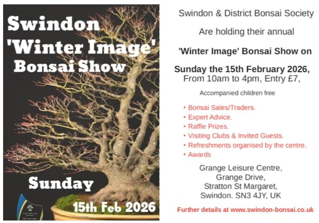 Event…… Swindon ‘Winter Image’ bonsai show, Sun 15th Feb 2026 at approx 10am. – 4pm. entry £7. accompanied child free. Grange Leisure centre, Grange Drive, Swindon. SN3 4JY UK.
